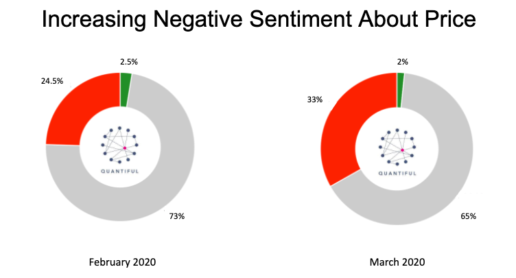 As economic storm clouds gather, consumers are understandably less confident about buying high-end electronics, yet the shift in sentiment is dramatic. Within a few weeks, negative sentiment (red) about the price of mobile devices increased from 24% of conversations in February to 33% in March, while positive (green) remained stable.